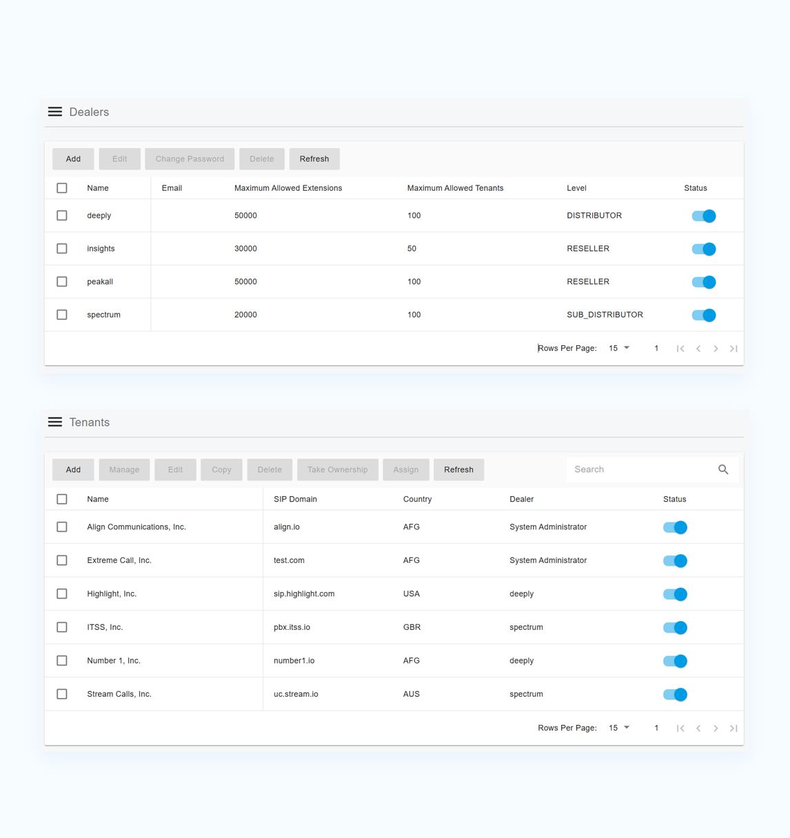 Unlike other pseudo multi-tenant PBXs, which are actually multiple instances of PBX systems managed through a centralized portal, My Phone System PBX delivers true multi-tenant functionality. This enables service providers to manage thousands of tenants and dealers on a single, unified infrastructure.
